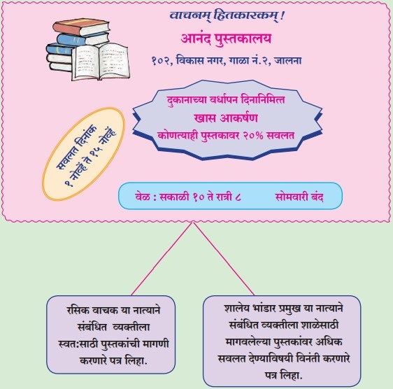 आजच्या वर्तमानपत्रातून आलेले आपल्या पुस्तकालयाचे हॅन्डबिल मी नुकतेच वाचले. आपण या पंधरवड्यासाठी सर्व पुस्तकांवर २०% सवलत देऊ केलेली आहे. मला हव्या असलेल्या पुस्तकांची यादी पुढे देत आहे. कृपया मला २०% सवलत दयावी आणि पुस्तके घरपोच देण्याची व्यवस्था करावी. टपालखर्च मी देईन. मी सदर पुस्तकांची नावे माझ्या मराठीच्या पाठ्यपुस्तकातून घेतली आहेत. त्यामुळे त्यांच्या किमती मला ठाऊक नाहीत. तरी सवलत वजा करून येणारी देय रक्कम आणि टपालखर्च ही एकूण रक्कम किती येते, ते कृपया माझ्या या ई-मेलला उत्तर देऊन कळवावे. त्या उत्तरातच आपण आपल्या बँक खात्याचा तपशील कळवला, तर मी ती रक्कम आपल्या खात्यात त्वरित ऑनलाइन भरीन. माझ्या पुस्तकांची यादी :