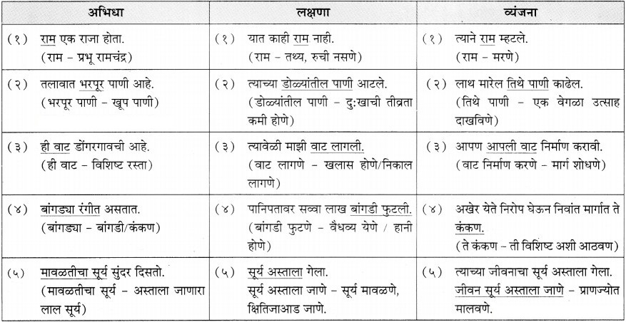 (२) अभिधा शक्तीच्या साहाय्याने प्रकट होणाऱ्या अर्थाला ‘वाच्यार्थ’ म्हणतात. | (२) लक्षणा शक्तीच्या साहाय्याने प्रकट होणाऱ्या अर्थास ‘लक्ष्यार्थ’ म्हणतात. | (२) व्यंजना शक्तीच्या साहाय्याने प्रकट होणाऱ्या अर्थास ‘व्यंगार्थ’ म्हणतात. |