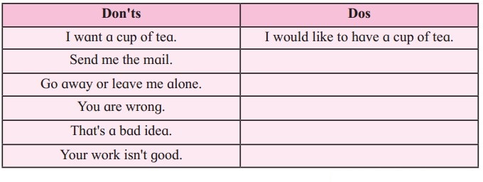 Etiquette and manners are very important for a person to live in the society. Read the following and put them in proper columns: