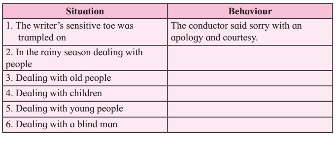 Good manners are required in our daily life for making our social contacts more cooperative and friendly. Illustrate the behaviour of the polite conductor with different people in various situations.
