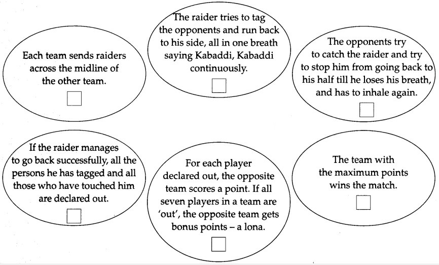 Arrange the points in proper order to show how the game of Kabaddi is played. Write the numbers in the blocks.