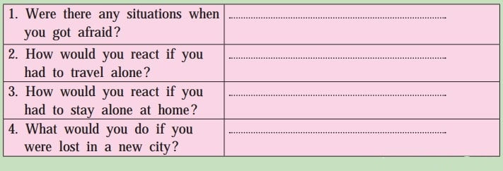1. Are there any situations when you get afraid? | – I Yes, I am afraid of sleeping in the dark at night, cold weather, street dogs, ghost stories and quarrels. |