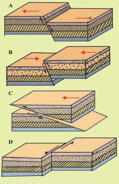 A – Normal fault B – Reverse fault C – Thrust fault D – Tear fault