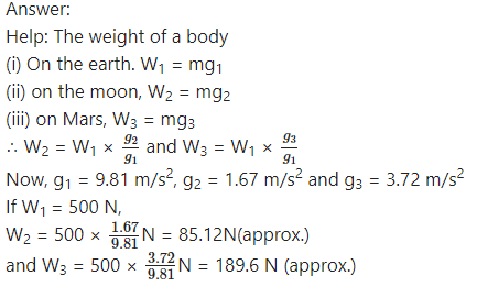 (c) The mass and weight of an object on the earth are 5 kg and 49 N respectively. What will be their values on the moon? Assume that the acceleration due to gravity on the moon is l/6th of that on the earth.