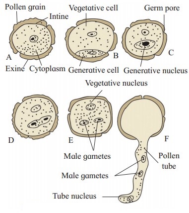 - The protoplast of pollen grain divides mitotically to form two unequal cells – a small thin walled generative cell and a large naked vegetative or tube cell.
