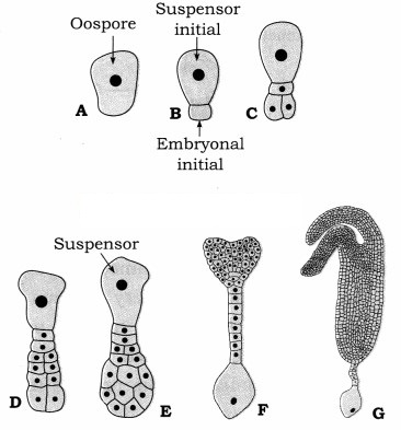 The oospore undergoes a transverse division to form a large basal cell towards the micropyle and a small apical or terminal cell towards the chalaza of the embryo sac. This two celled structure is called proembryo. The basal cell or suspensor initial undergoes repeated transverse divisions to form a multicellular structure called suspensor. The suspensor pushes the embryo towards the endosperm to draw its nutrition.