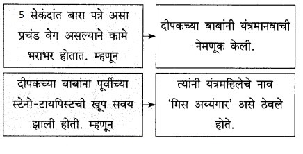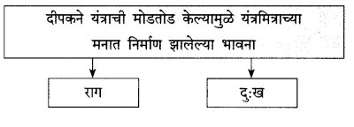 1. रात्री पडलेल्या स्वप्नामुळे दीपक पुरता हादरला होता. यंत्रांचा धोका बाबांना सांगावा म्हणून तो बाबांकडे धावला. यंत्र-अधिकाऱ्यांना काढून टाकावे आणि पूर्वीच्या माणसांना कामावर घ्यावे, अशी सूचना त्याने बाबांना केली.