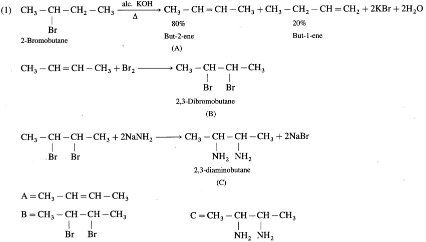 Complete the following reaction sequences by writing the structural formulae of the organic compounds ‘A’, ‘B’ and ‘C’.
