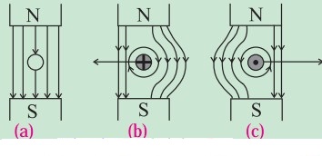 If a wire without any current is kept in a magnetic field, then it experiences no force as shown in figure (a). But when the wire is carrying a current into the plane of the paper in the magnetic field, a force will be exerted on the wire towards the left as shown in the figure (b). The field will be strengthened on the right side of the wire where the lines of force are in the same direction as that of the magnetic field and weakened on the left side where the field lines are in opposite direction to that of the applied magnetic field. For a wire carrying a current out of the plane of the paper, the force will act to the right as shown in figure (c).
