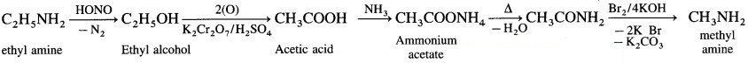 The starting compound methyl bromide contains one carbon atom while the product ethylamine contains two carbon atoms. A reaction in which number of carbons increases involves a step up reaction. The overall conversion of methyl bromide into ethyl amine is a step up conversion.