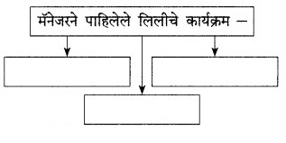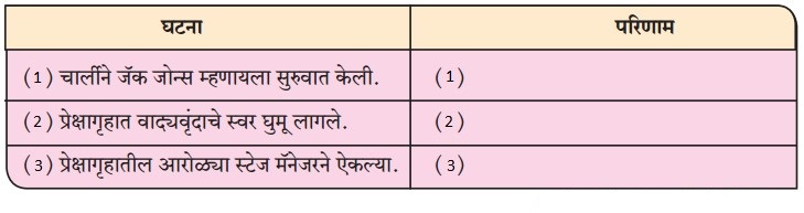 3. प्रेक्षागृहातील आरोळ्या स्टेज मॅनेजरने ऐकल्या. | 3. स्टेज मॅनेजर धावतपळत आला आणि विंगेत. चार्लीच्या शेजारी उभा राहिला. गोंधळून जाऊन लिलीकडे बघत राहिला. |