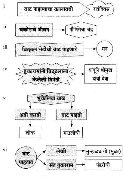 7. मध्यवर्ती कल्पना – संत तुकारामांनी तन, मन, धन अर्पून विठ्ठलाची भक्ती केली. अगदी मनापासून त्याचे नामस्मरण केले. अशा या आपल्या भगवंताच्या म्हणजेच विठ्ठलाच्या भेटीची अनावर ओढ त्यांच्या मनात निर्माण झाली. त्यासाठी अतिशय समर्पक उदाहरणे वापरून त्यांनी ‘भेटीलागी जीवा’ या अभंगातून ती ओढ व्यक्त केली आहे.