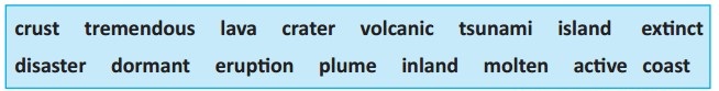 active, coast, crater, crust, disaster, dormant, eruption, extinct, inland, island, lava, molten, plume, tremendous, tsunami, volcanic.