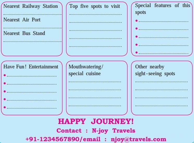 2. Prepare a Travel Brochure or leaflet of your native place or any town/historical place/hill station to attract tourist using the points below.