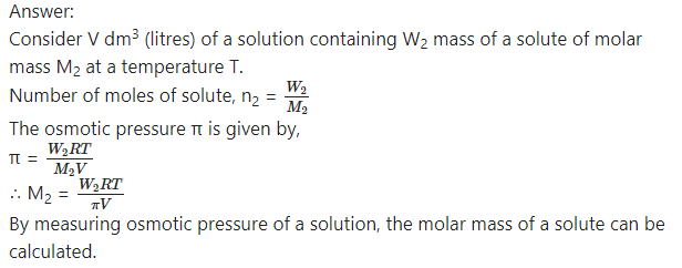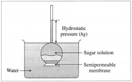 (2) Explanation : Consider an inverted thistle funnel on the mouth of which a semipermeable membrane is firmly fastened. It is filled with the experimental solution and immersed in a solvent like water. As a result, solvent molecules pass through the membrane into the solution in the funnel causing rising of level in the arm of thistle funnel. This increases the hydrostatic pressure. At a certain stage this rising level stops indicating an equilibrium between the rates of flow of solvent molecules from solvent to solution and from solution to solvent. The hydrostatic pressure at this stage represents osmotic pressure of the solution in the thistle funnel.