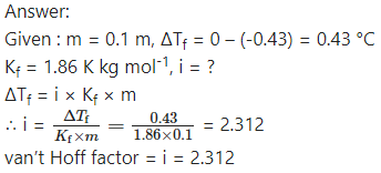 A 0.1 m solution of K2SO4 in water has freezing point of -0.43 °C. What is the value of van’t Hoff factor if Kf for water is 1.86 K kg mol-1?