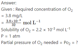 Fish generally needs O2 concentration in water at least 3.8 mg/L for survival. What partial pressure of O2 above the water is needed for the survival of fish? Given the solubility of O2 in water at 0 °C and 1 atm partial pressure is 2.2 × 10-3 mol/L (0.054 atm)