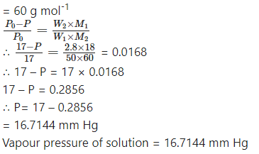 The vapour pressure of water at 20 °C is 17 mm Hg. What is the vapour pressure of solution containing 2.8 g urea in 50 g of water? (16.17 mm Hg)