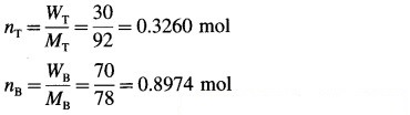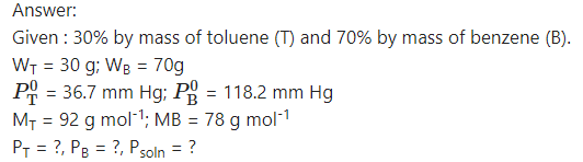A mixture of benzene and toluene contains 30% by mass of toluene. At 30°C, vapour pressure of pure toluene is 36.7 mm Hg and that of pure benzene is 118.2 mm Hg. Assuming that the two liquids form ideal solutions, calculate the total pressure and partial pressure of each constituent above the solution at 30°C.