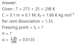 At 25 °C a 0.1 molal solution of CH3COOH is 1.35% dissociated in an aqueous solution. Calculate freezing point and osmotic pressure of the solution assuming molality and molarity to be identical.