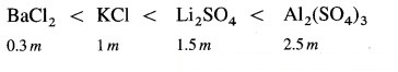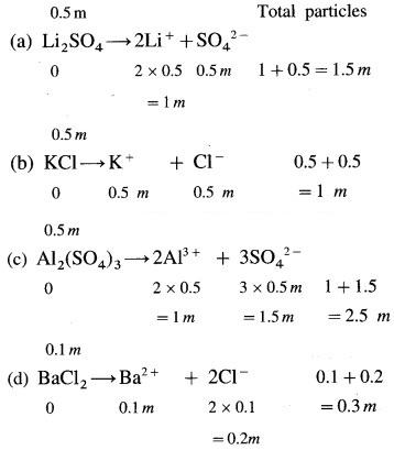Arrange the following solutions in order of increasing osmotic pressure. Assume complete ionization. (a) 0.5 m Li2SO4 (b) 0.5 m KCl (c) 0.5 m Al2(SO4)3 (d) 0.1 m BaCl2.
