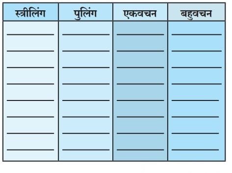 वृत्त में दिए शब्दों के लिंग तथा वचन के अनुसार वर्गीकरण कीजिए।