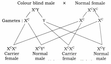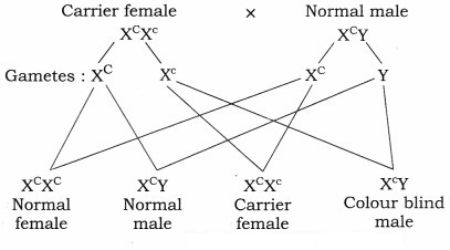 (2) Carrier female with normal male. Such a cross produces 25% normal daughters, 25% normal sons, 25% carrier daughters and 25% colour blind sons.