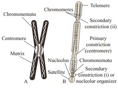 (4) Additional narrow areas called secondary constrictions are seen in some chromosomes which are known as nucleolar organizers. They help in the formation of nucleolus. At secondary constriction (i) there is nucleolar organising region. Secondary constriction (ii) shows attachment of satellite body or SAT body.