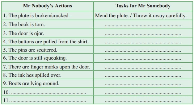 Mr Nobody seems to be a very mischievous, playful and irresponsible person. He does not handle things with care as he breaks plates. He behaves in a very careless manner by leaving the door ajar. He seems to be very insensitive to others’ problems because he pulls out buttons from shirts and scatters pins.