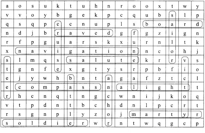 1. In pairs find as many meaningful words as you can from the following grid within five minutes. You can find words horizontal and vertically. (Hint – The words are related to battles or battleships. For example, soldier.
