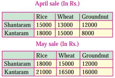 ∴ The total sale of April and May of Shantaram in ₹ is ₹ 33000 (rice), ₹ 28000 (wheat), ₹ 24000 (groundnut), and that of Kantaram in ₹ is ₹ 39000(rice), ₹ 31500(wheat), and ₹ 24000 (groundnut).