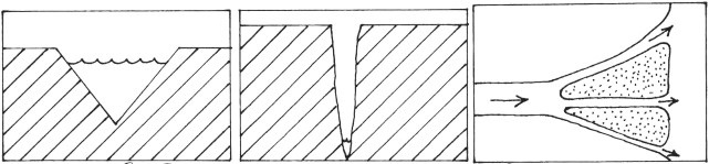 - Hence, the slopes recedes and the valley with near-vertical sides becomes wider, resembling the letter ‘V’.