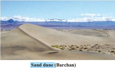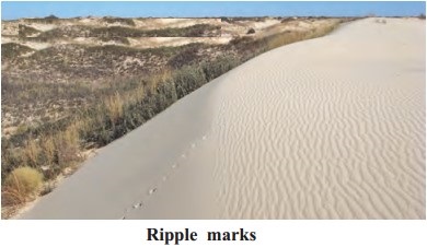 - Sand dunes, barchans, seifs, ripple marks, loessplains, etc. are formed by deposition by wind.