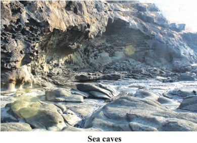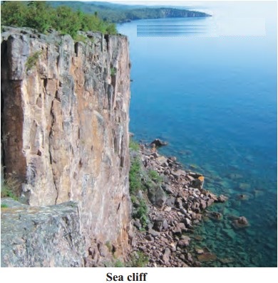 - Landforms such as sea cliffs, sea caves, wave- cut platforms, sea arches and sea stacks are formed due to the erosional work of sea waves.
