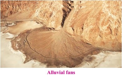 - As these are deposited in a triangular shape, they form an alluvial fan. As the steepness of the slope decreases and the transport capacity of the river reduces, it starts flowing slowly.