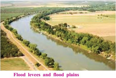 - Flood levees: When in flood, the river deposits ; the coarser material on the banks which in duecourse rises parallel to the banks of the river. These are called ‘flood levees’.