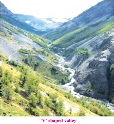 - A ‘V shaped valley is formed due to the erosional work of a river.