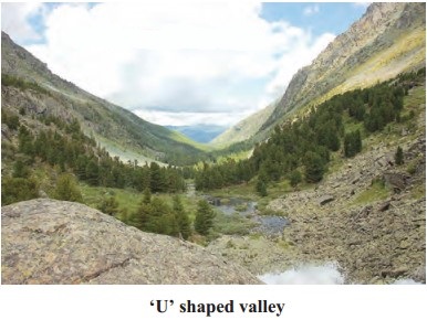 - Though the velocity of glaciers is less, the mass of the ice is more and hence the glacier erodes its own banks and its bed on a large scale.