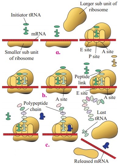 - Ribosome has three binding sites for t-RNA : P-site (peptidyl t-RNA-site), A-site (aminoacyl t-RNA-site) and E-site (exit site).