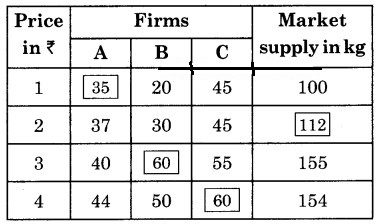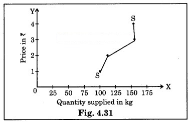 When the schedule is plotted on the graph we get a market supply curve ‘SS’ which is upward sloping. This curve shows that as price rises from ₹ 1 to ₹ 2, supply rises from 1oo to 112 kg, but when price rises from ₹ 2 to ₹ 3, supply rises to a greater extent from 112 kg to 155 kg in the market. When price rises to ₹ 4 Supply falls from 155 kg to 154 kg. This may be because of perishable or seasonal good that supply could not Jj be increased and supply falls. This show backward bending supply curve, showing partly an exception to the supply curve.