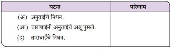(आ) ताराबाईंनी अनुताईंचे अश्रू पुसले. | डोंगराएवढे दुःख त्यांनी फेकून दिले आणि जिद्दीने उभ्या राहिल्या. |