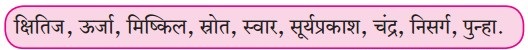 क्षितिज, ऊर्जा, मिष्किल, स्रोत, स्वार, सूर्यप्रकाश, चंद्र, निसर्ग, पुन्हा.