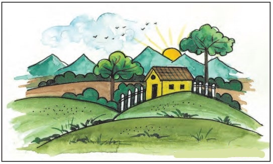 हे एक सुंदर निसर्ग चित्र आहे. आकाशात ढग आहेत. पक्षी उडत आहेत. डोंगरांच्या रांगेतून सूर्योदय होत आहे. सुंदर हिरवळ, झाडे आहेत. एक टुमदार घर आहे. घराला कुंपण आहे. सकाळची प्रसन्न वेळ आहे. सर्वत्र गवत उगवले आहे. घराच्या आसपास गर्द झाडी आहे.