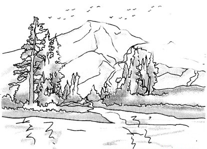 चित्रात हिमालयाच्या रांगा आहेत. त्यावर पांढराशुभ्र बर्फ आहे. देवदारचे उंच उंच वृक्ष आहेत. धबधब्याचे पाणी पडत आहे. पक्षी उडत आहेत. निसर्ग सौंदर्य अप्रतिम आहे.