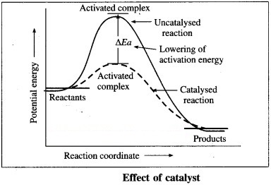 (iii) In the presence of the catalyst, the activation energy of the reaction is lowered. The height of activation energy barrier is less than that in the uncatalysed reaction.