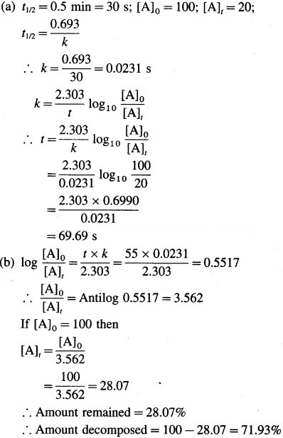 The half-life of a first-order reaction is 0.5 min. Calculate (a) time needed for the reactant to reduce to 20% and (b) the amount decomposed in 55 s.