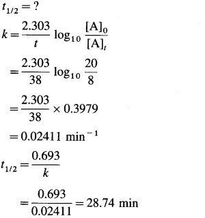 In a first order reaction, the concentration of reactant decreases from 20 mmol dm-3 to 8 mmol dm-3 in 38 minutes. What is the half life of reaction? (28.7 min)