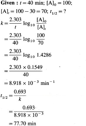 A first order reaction takes 40 minutes for 30% decomposition. Calculate its half life. (77.66 min)