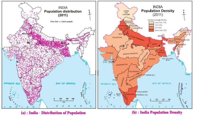 - Hence, India’s average population density is high i.e. 382 persons per sq. km.