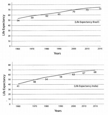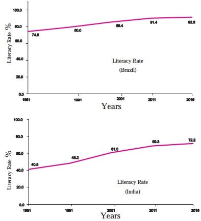 The graphs indicate the literacy rate of India and Brazil (in percentage).